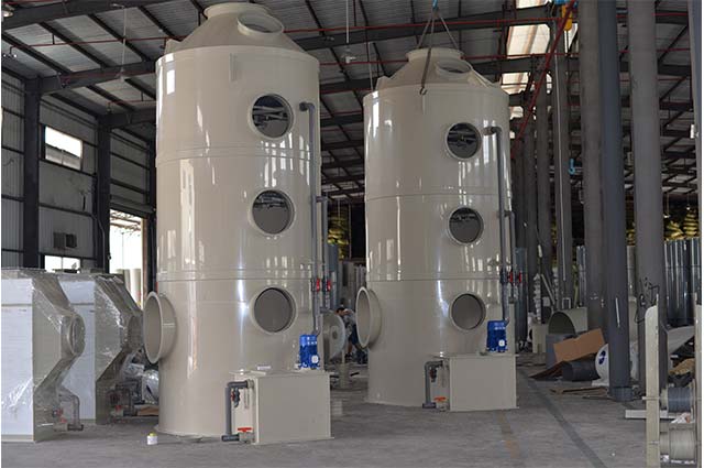 PP噴淋塔也叫做PP洗滌塔、酸霧凈化塔--酸堿廢氣處理設備;噴淋塔工作原理:廢氣由風管引入凈化塔,經(jīng)過填料層,廢氣與吸收液進行氣液兩相充分接觸吸收中和反應,廢氣經(jīng)過凈化后,再經(jīng)除霧板脫水除霧后由風機排入大氣。廢氣達到地方排放標準的排放要求。